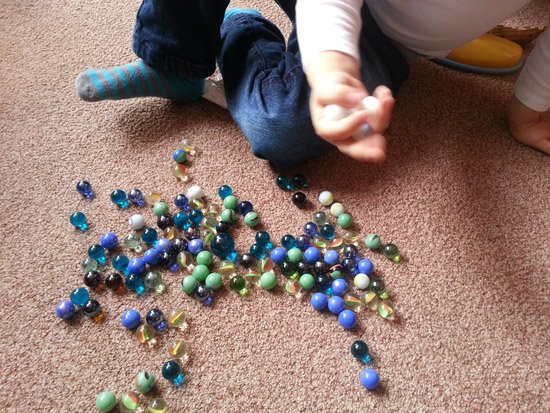 C’est en rentrant à la maison en montrant ma trouvaille à mon fils que j’ai vu à quel point ce simple objet lui faisait tout autant plaisir qu’un gros paquet de cartes à la mode. Du coup nous avons passé une après midi à jouer aux billes, apprendre quelques jeux avec les billes, les utiliser comme marchandises avec son petit train, les utiliser pour faire des circuits de billes etc…
